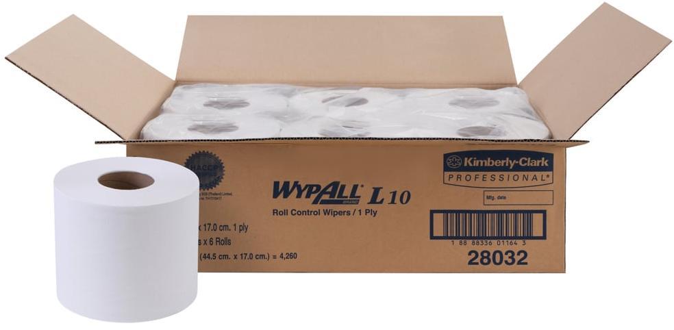 WYPALL* L10 Roll Control Wipers 28032 กระดาษเช็ดอเนกประสงค์ สำหรับงานที่เกี่ยวข้องกับผลิตภัณฑ์อาหาร เพื่อความสะอาดและสุขอนามัยสูงสุด ด้วยระบบจ่ายกระดาษครั้งละ 1 แผ่น จึงใช้ได้สะดวก ป้องกันการปนเปื้อน และช่วยควบคุมค่าใช้จ่ายได้เป็นอย่างดี