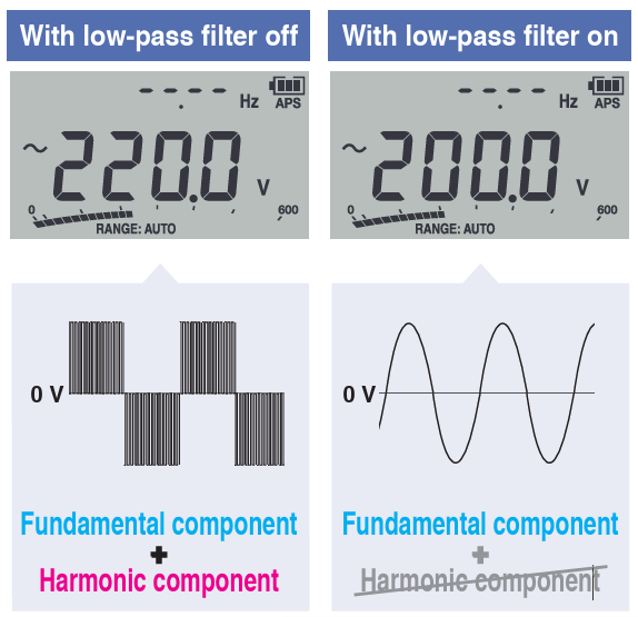 - ปัญหา: ดิจิตอลมัลติมิเตอร์ที่ไม่มี Low-pass Filter จะอ่านค่ารวมของแรงดันไฟฟ้าทั้งหมด ซึ่งรวมถึงสัญญาณรบกวนความถี่สูงเหล่านี้ด้วย ทำให้ค่าที่วัดได้ สูงกว่า แรงดันไฟฟ้าจริงของความถี่หลัก 50 Hz หรือ 60 Hz ที่มอเตอร์ต้องการ